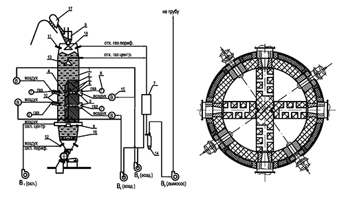 Особенностью известковых шахтных печей круглого сечения конструкции ЗАО «Липецкметаллургпроект» является использование для ввода в зону обжига горючей смеси керамического керна в виде диаметрально расположенных крестом двух стенок, закрепленных в футеровке печи. Керн выполняется из огнеупорного кирпича по специальной технологии, обеспечивающей его высокую механическую прочность при температурах 1500оС и выше. Внутри керна выполнены жаровые каналы с окнами для выхода газов в слой обжигаемого материала.